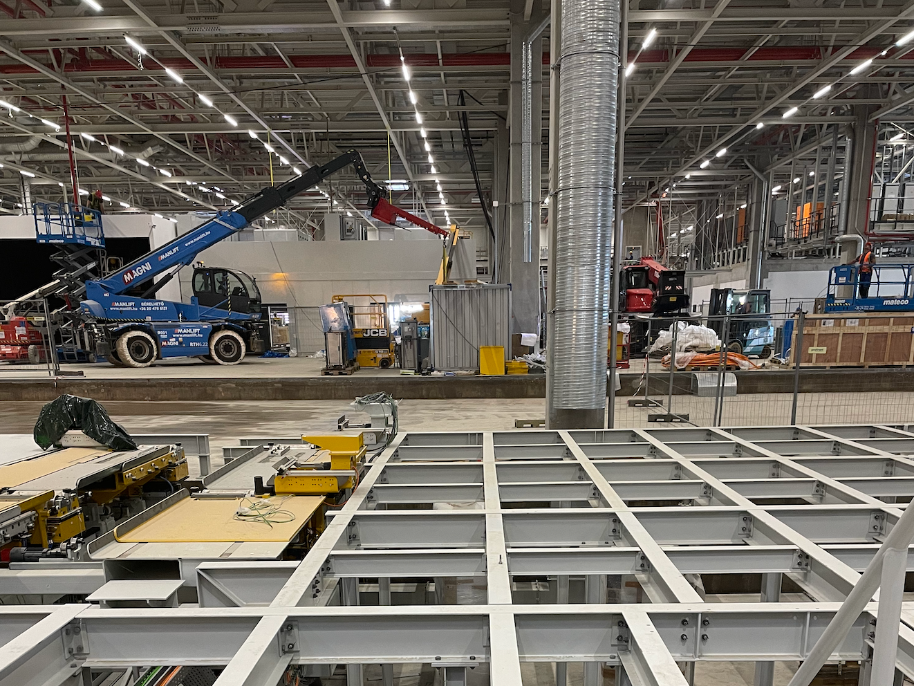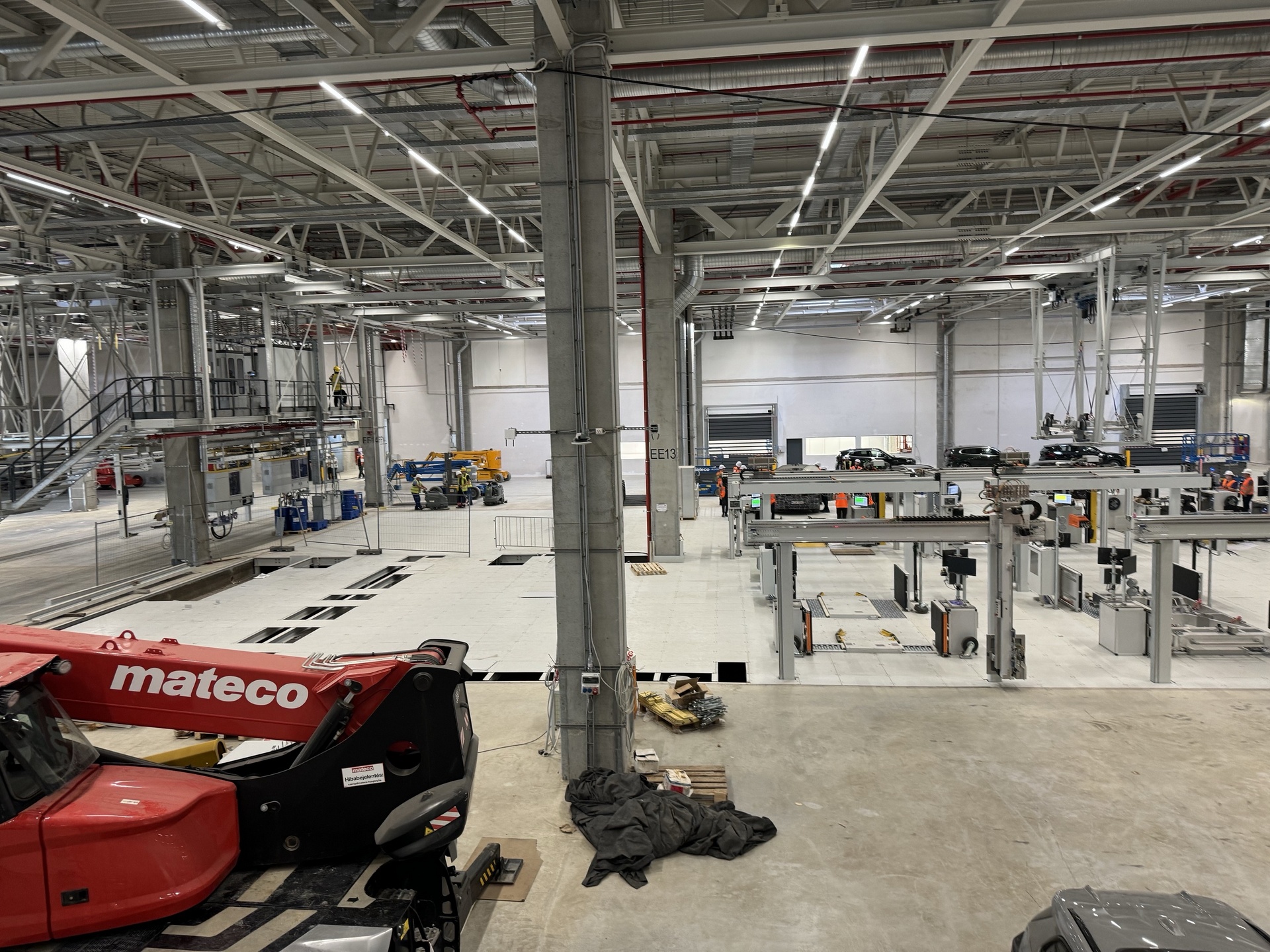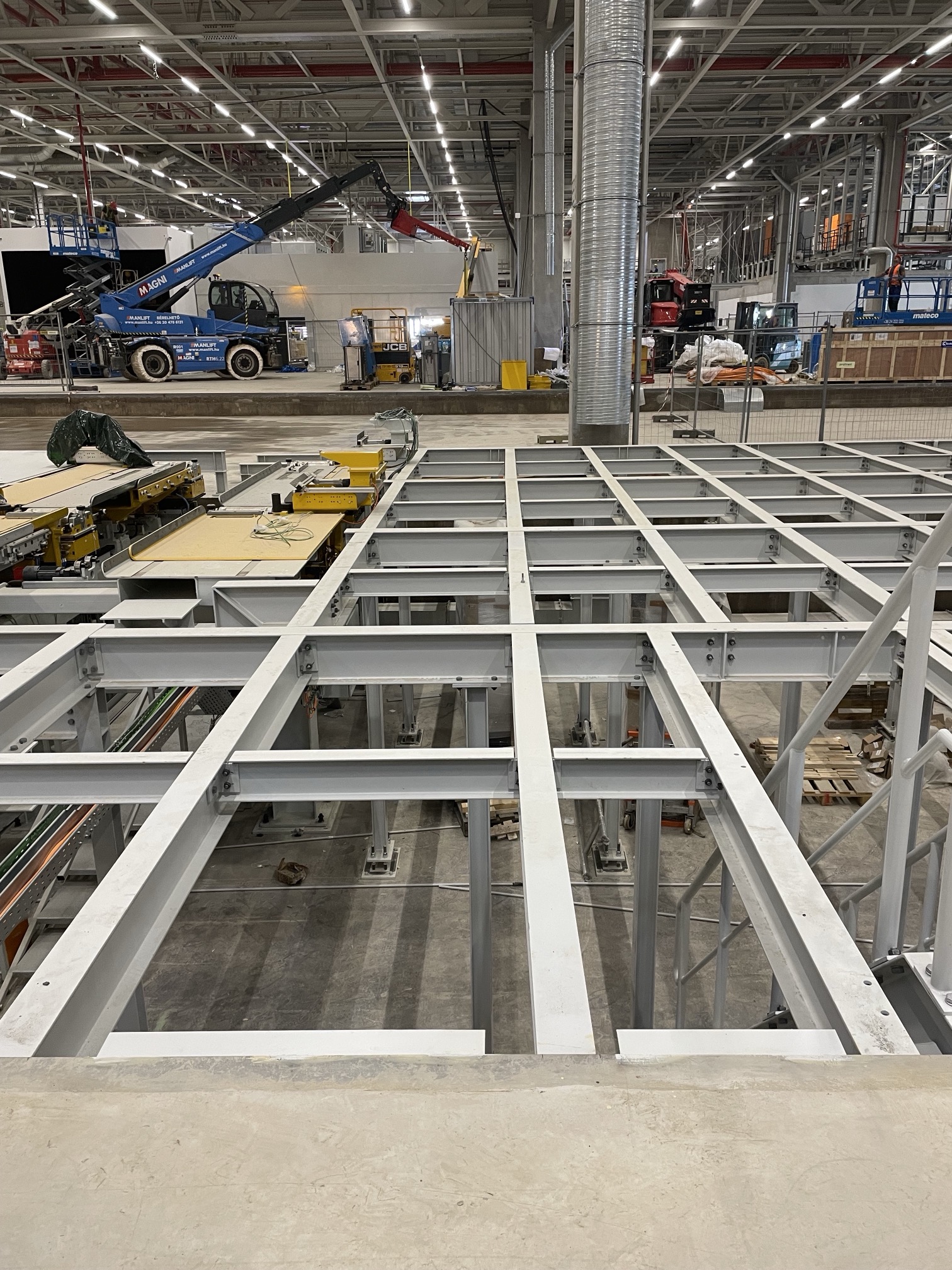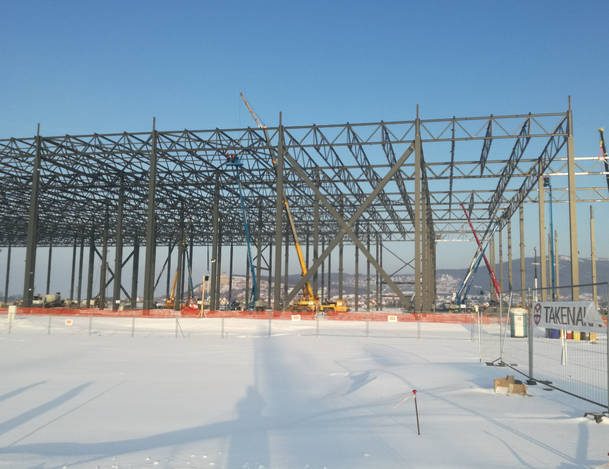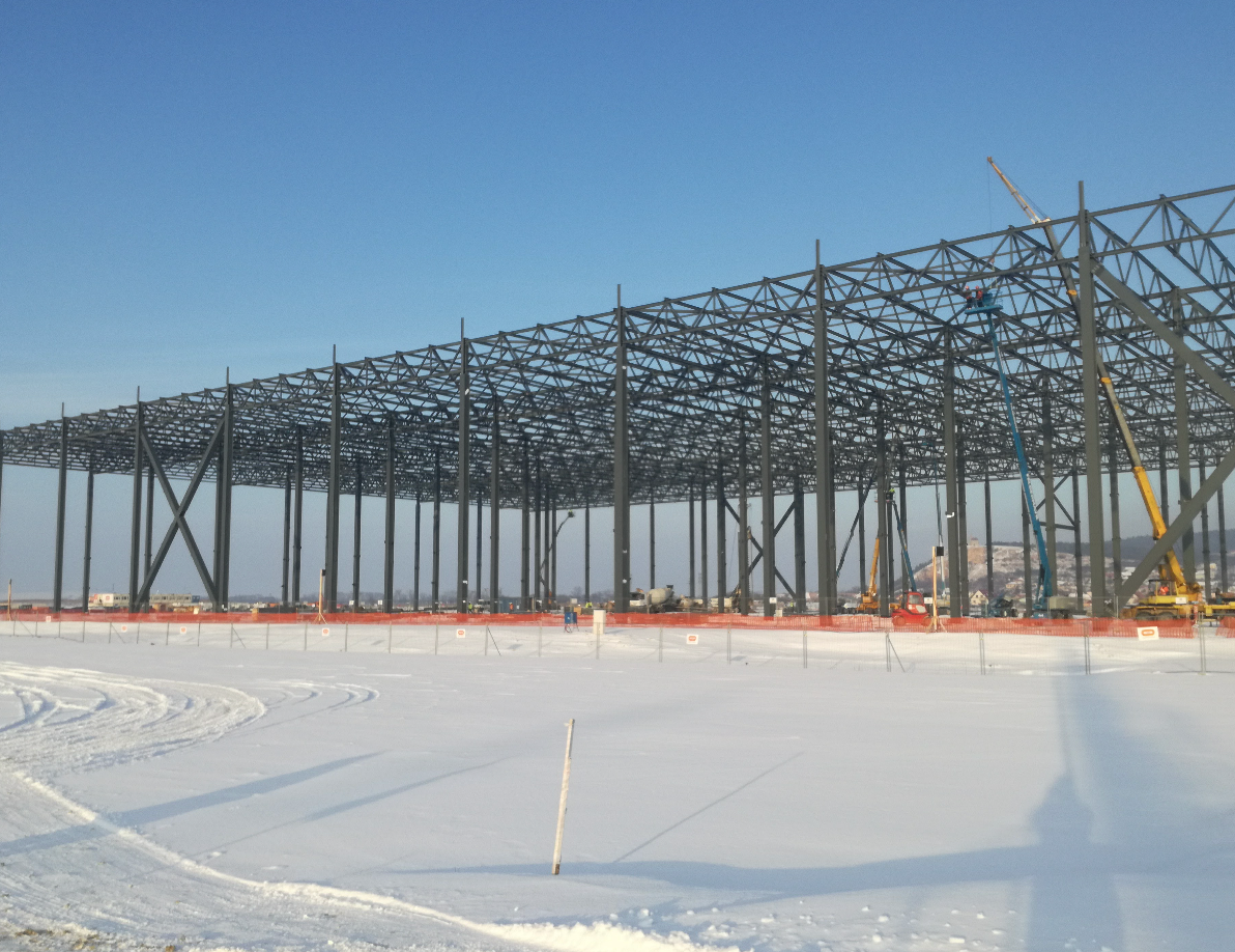 Hall and podium structure production and construction project in the north-western area of Debrecen, on a more than 400 hectare site, in the wheel centring hall part of the plant, with crane tracks.