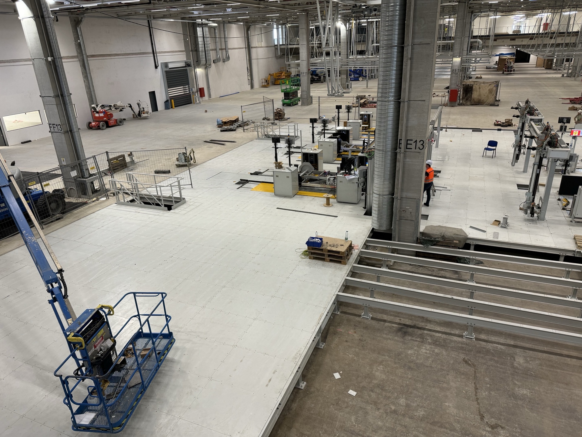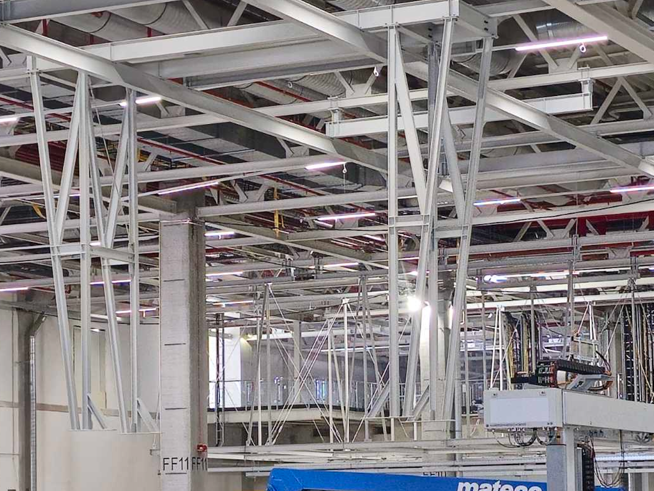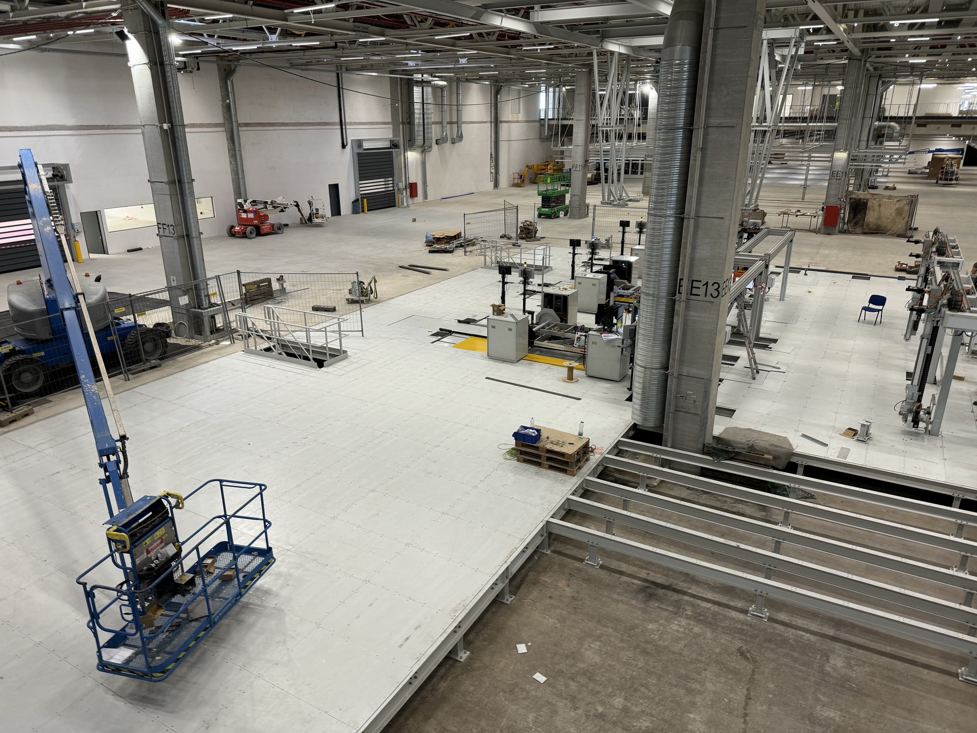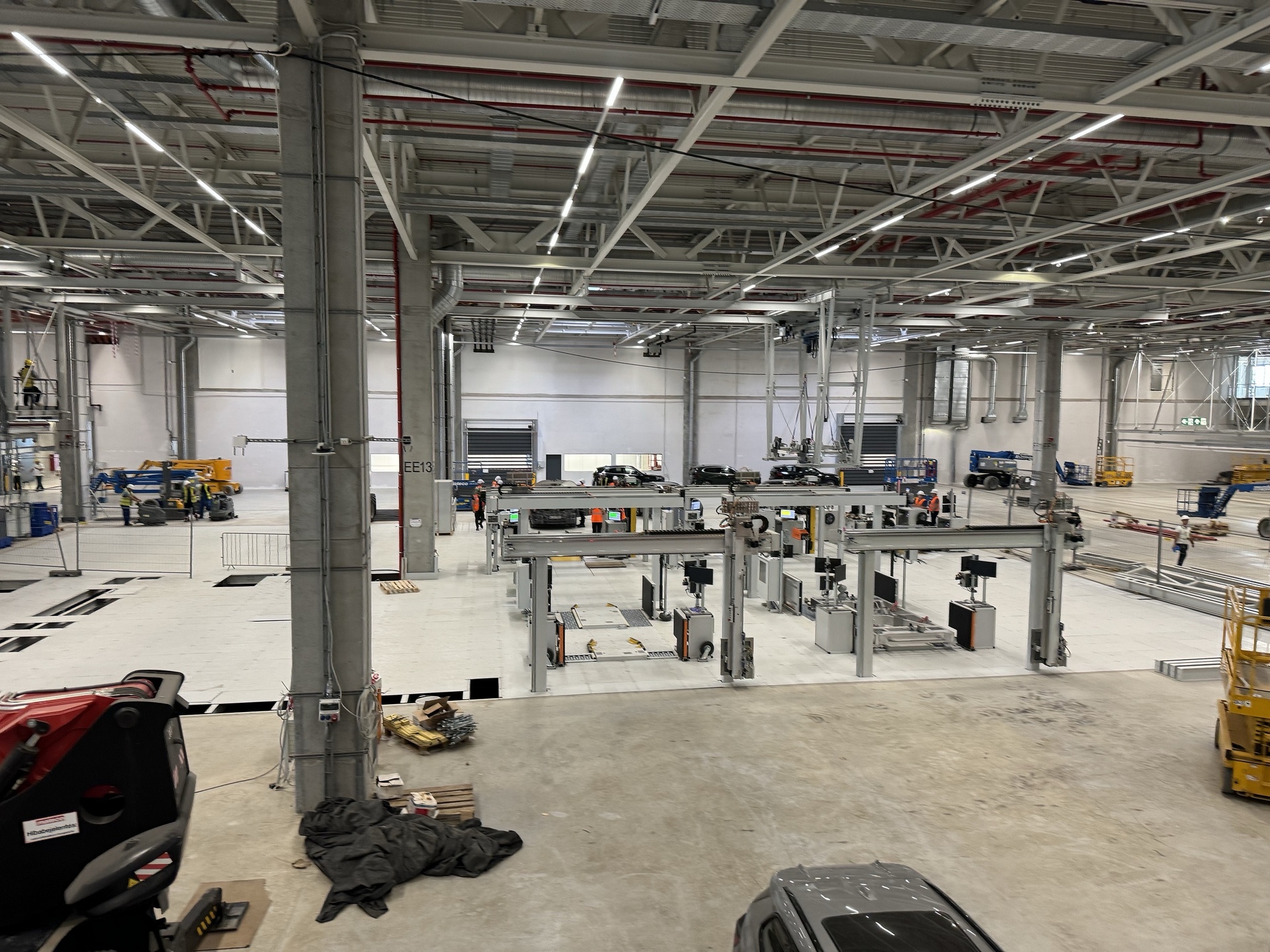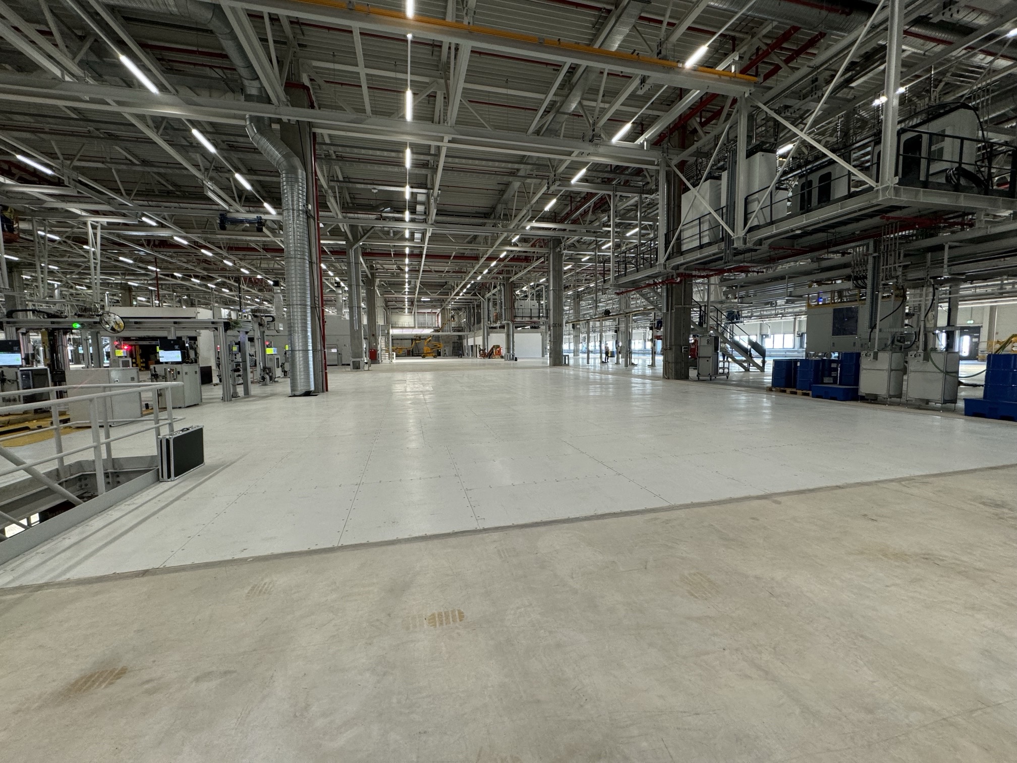 Hall and podium structure production and construction project in the north-western area of Debrecen, on a more than 400 hectare site, in the wheel centring hall part of the plant, with crane tracks.
