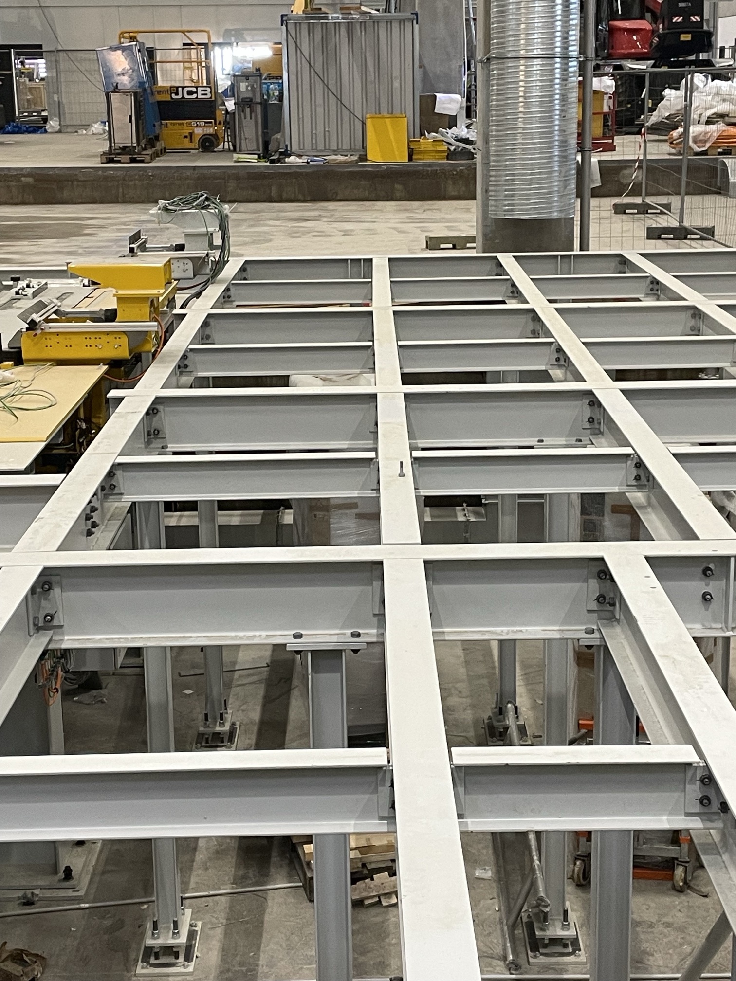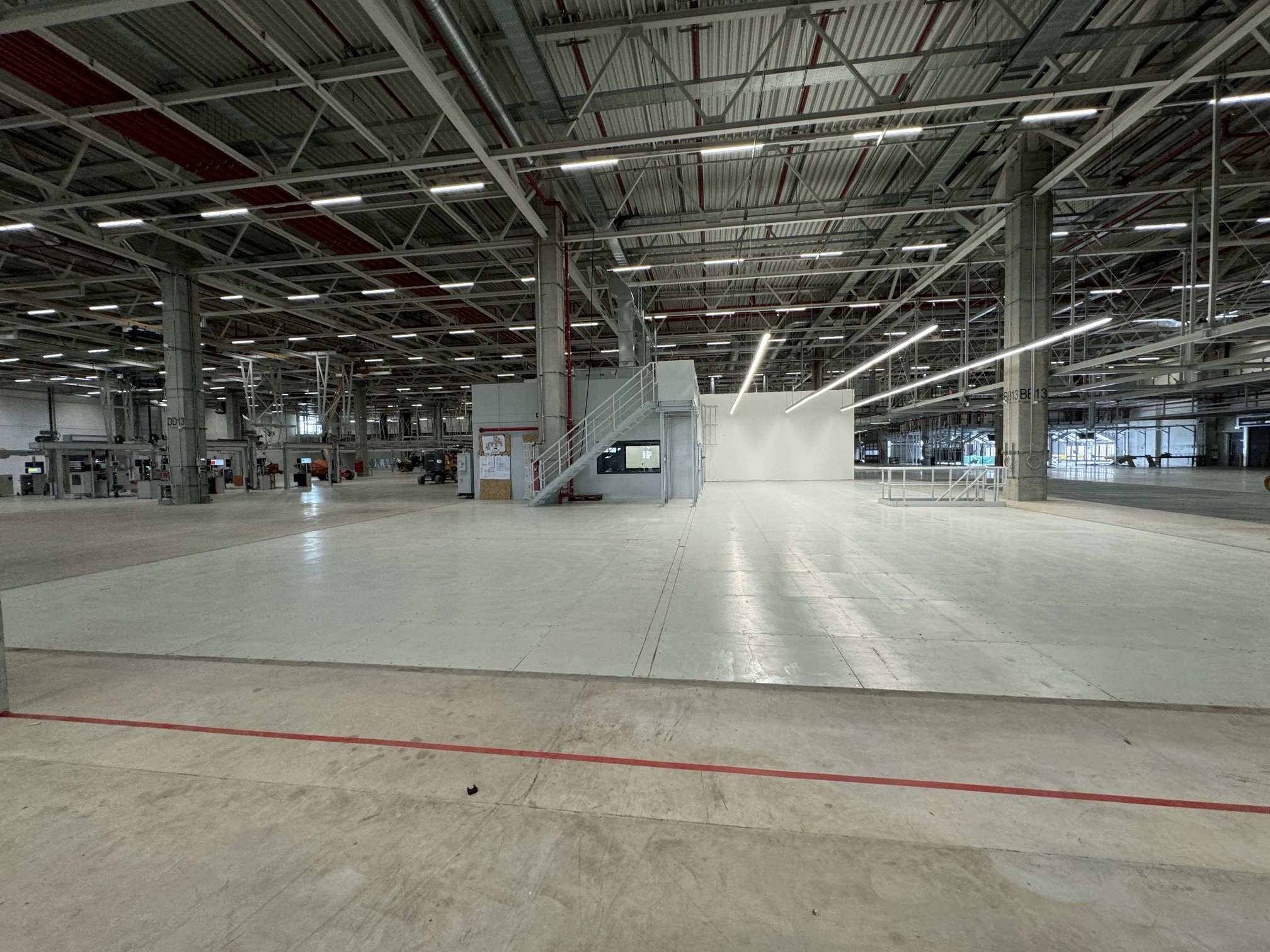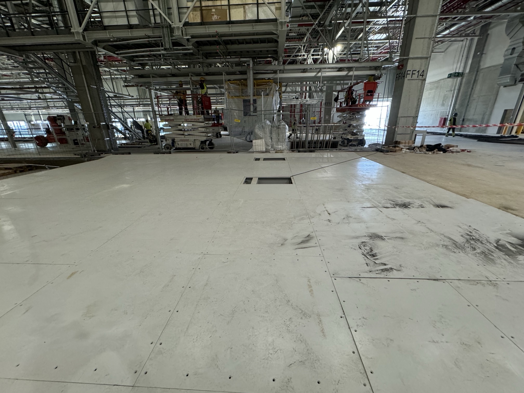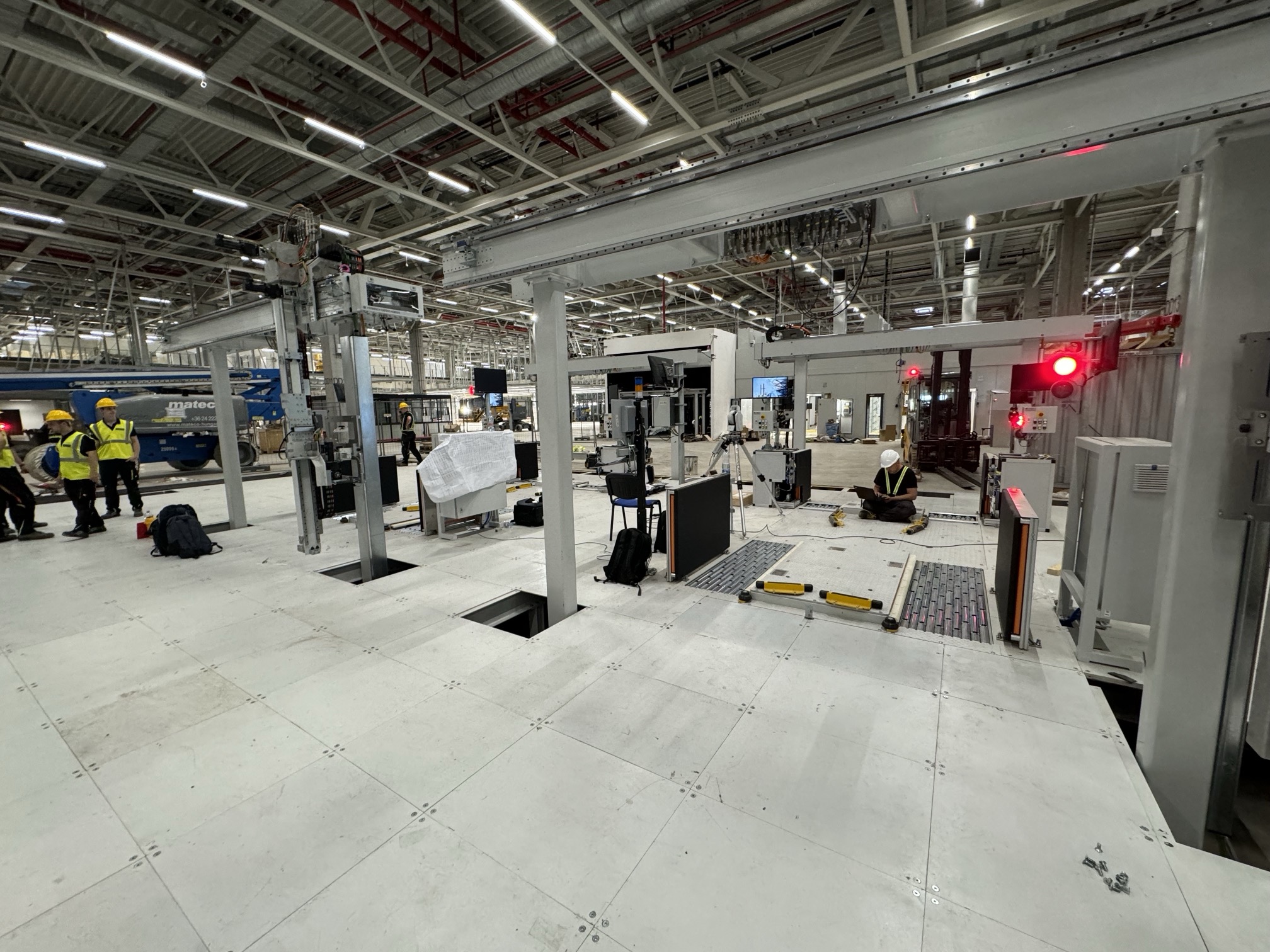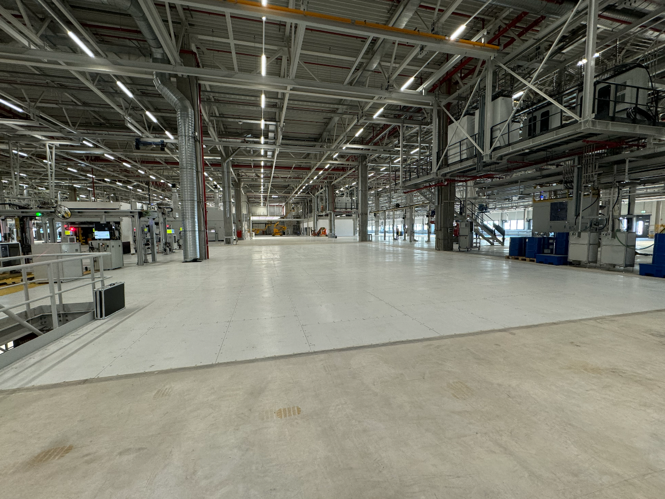 Hall and podium structure production and construction project in the north-western area of Debrecen, on a more than 400 hectare site, in the wheel centring hall part of the plant, with crane tracks.